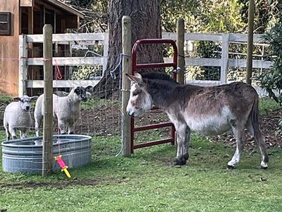 But don't let his laid-back demeanor fool you — Leon has a mischievous streak as wide as his pasture. Anything that dares to trespass into his field is met with a swift chase and a firm ear-pinning, whether it's dogs, cats, or even the occasional raccoon. Sorry folks, no unauthorized visitors allowed! Talk about practicing biosecurity!