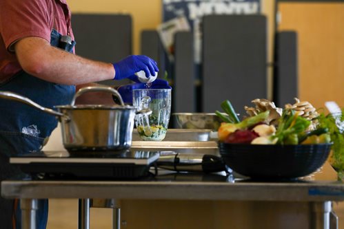 The final stop for conference-goers was Freeman School District, where Mataio Gillis, a former Chef and Culinary Program Supervisor from Bellingham Public Schools, did a live cooking session on how school nutrition employees can integrate local produce into school meals. Recipes like yogurt and buttermilk dressing, pizza made with local bakery Rind & Wheat pizza dough, and toppings bar ideas for tacos, pizza, and hamburgers were just a few demonstrated.