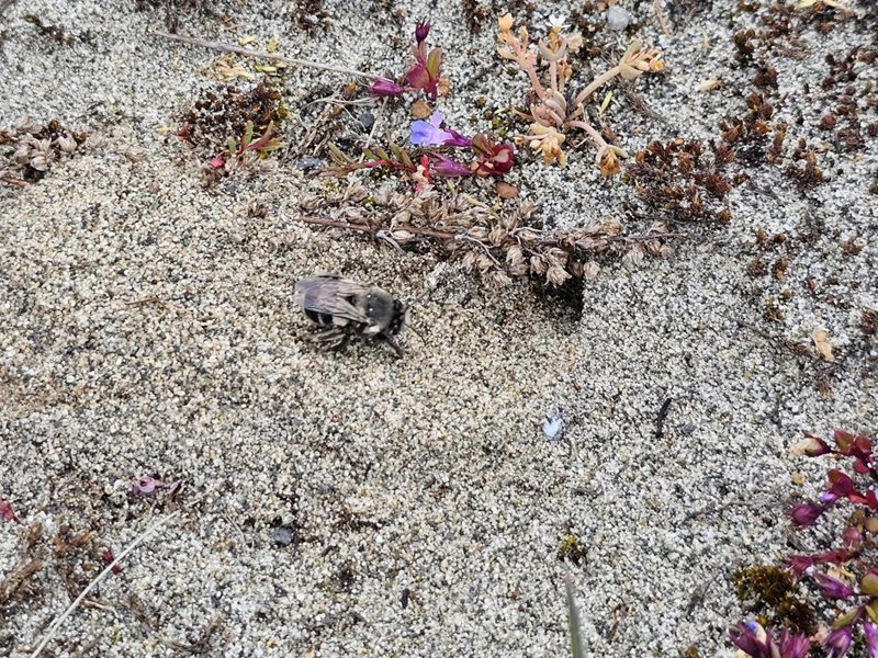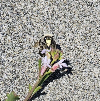 A male Anthophoroa bomboides - aka bumblebee like digger bee - enjoys a searocket flower at Fort Flagler State Park.