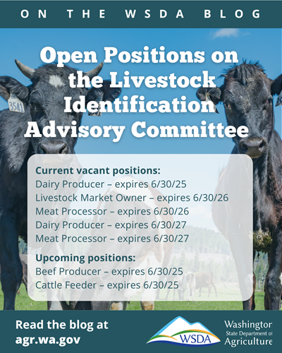 This year the Livestock Identification Advisory Committee will have several positions open. The committee provides advice to the director of the Washington State Department of Agriculture (WSDA) regarding the WSDA Livestock Identification Program, inspection fees, and related licensing fees.