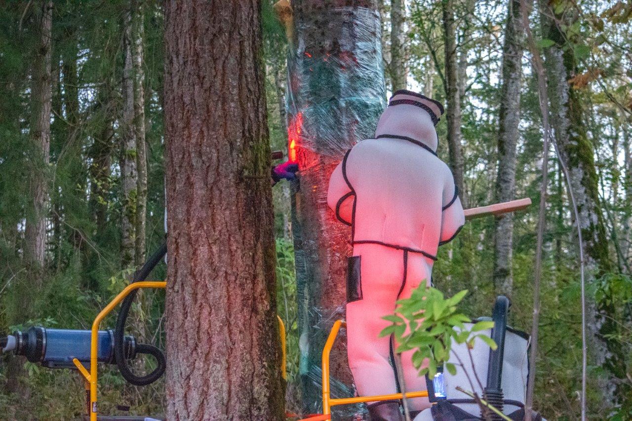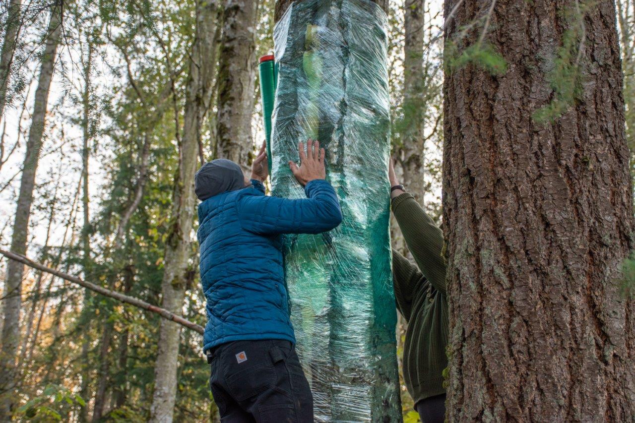 The work proceeded slowly at first, with very few hornets emerging. The team members used a wooden board and some smart whacks against the tree to encourage more hornets to leave the nest. This proved successful. When the hornets stopped coming out of the nest, the team pumped carbon dioxide into the tree to kill or anaesthetize any remaining hornets. They then sealed the tree with spray foam, wrapped it again with cellophane, and finally placed traps nearby to catch any potential survivors or hornets who may have been away during the operation and return to the tree. The work was completed by 9 a.m.