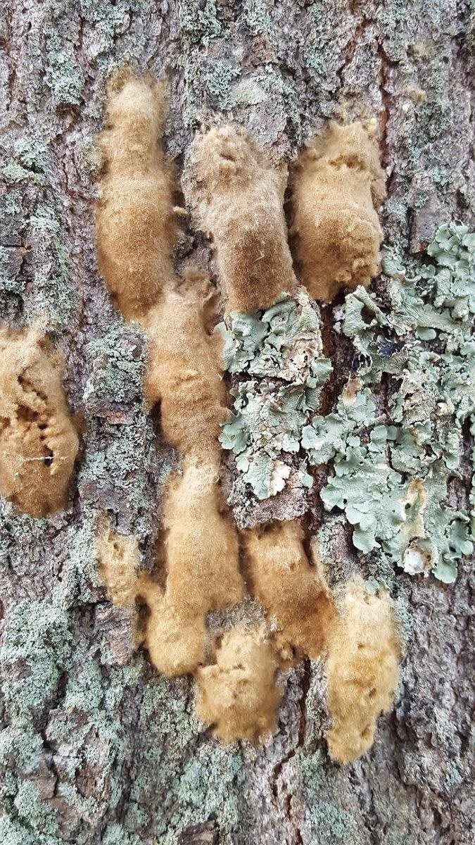 Spongy moths start as eggs that are laid in masses that have a “spongy” appearance. These egg masses are laid in the summer on trees, shrubs, or any outdoor surface. The eggs overwinter and hatch in the spring when trees are leafing out with fresh, tender new growth.