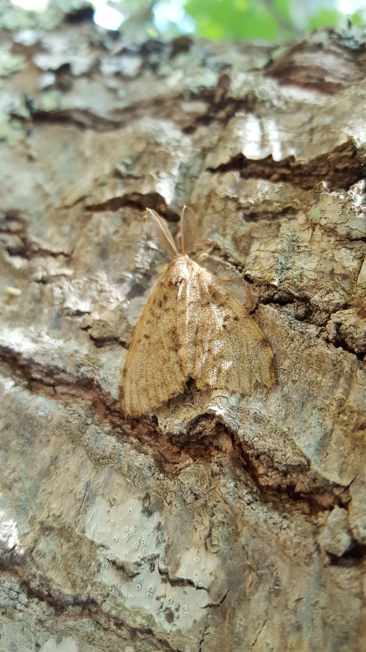 Male moths are about an inch long and tan/brown in color with wavy lines and a distinct “dot and comma” marking on each wing. They have large, feathery antennae that they use to detect the scent of females from up to a mile away.