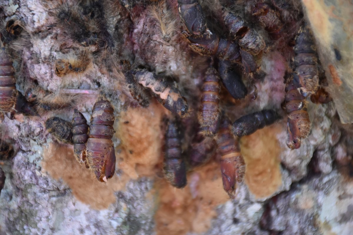 After eating their fill of trees and shrubs, the caterpillars pupate. The pupa is generally a dark brown color. They can usually be found attached to tree trunks, buried in leaf litter, or attached to almost any outdoor surface. Pupation lasts approximately 1-2 weeks.