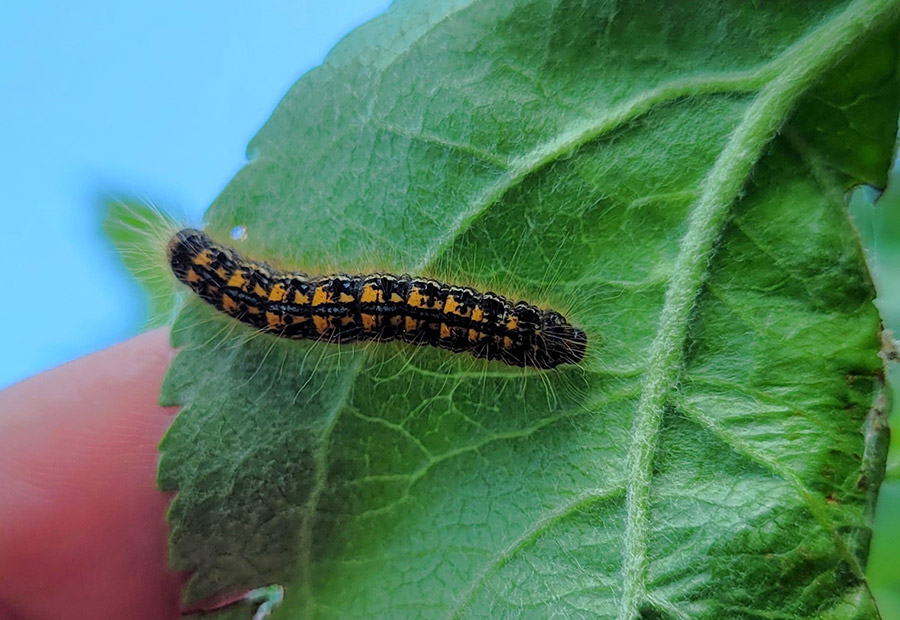 When they emerge, the caterpillars are very small – about a quarter of an inch. But they are very hungry eaters and quickly grow up to three inches long within a few weeks. As they mature, they develop five pairs of blue dots followed by six pairs of red dots on their backs. It is only the caterpillars that eat and damage trees and shrubs.