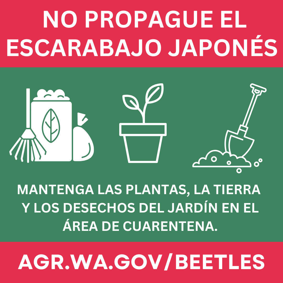 - Proteja nuestra comunidad de los escarabajos japoneses, ¡no contribuya a su propagación! Obtenga más información en agr.wa.gov/beetles.