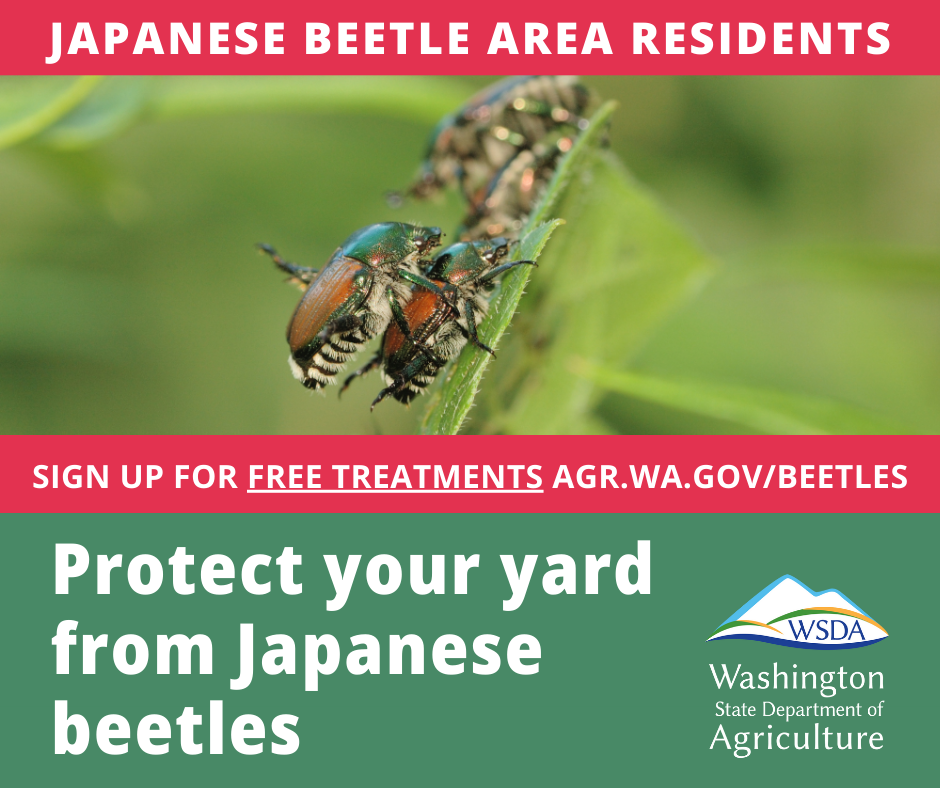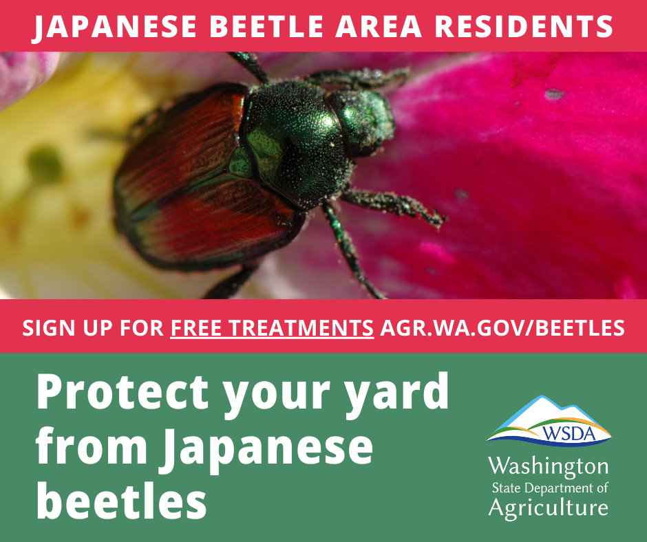 - If you live in a Japanese beetle treatment area, answer the call! Sign up to have your yard treated for Japanese beetles for FREE. Learn more at agr.wa.gov/beetles.