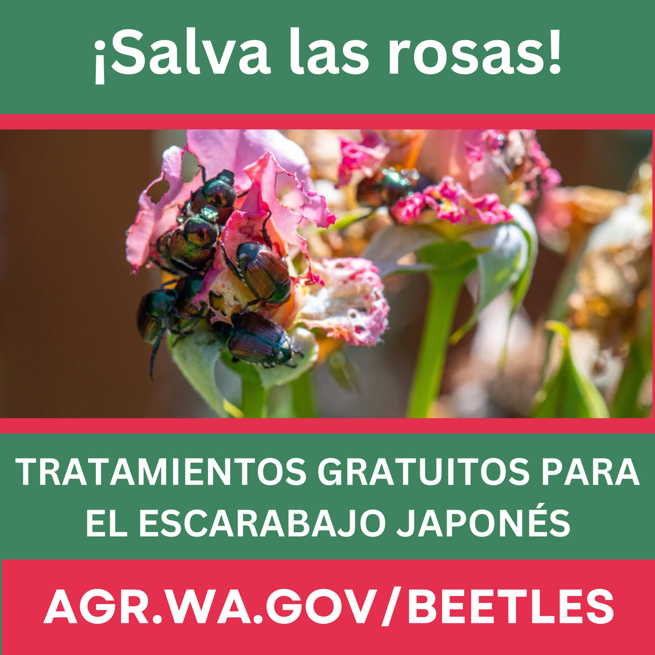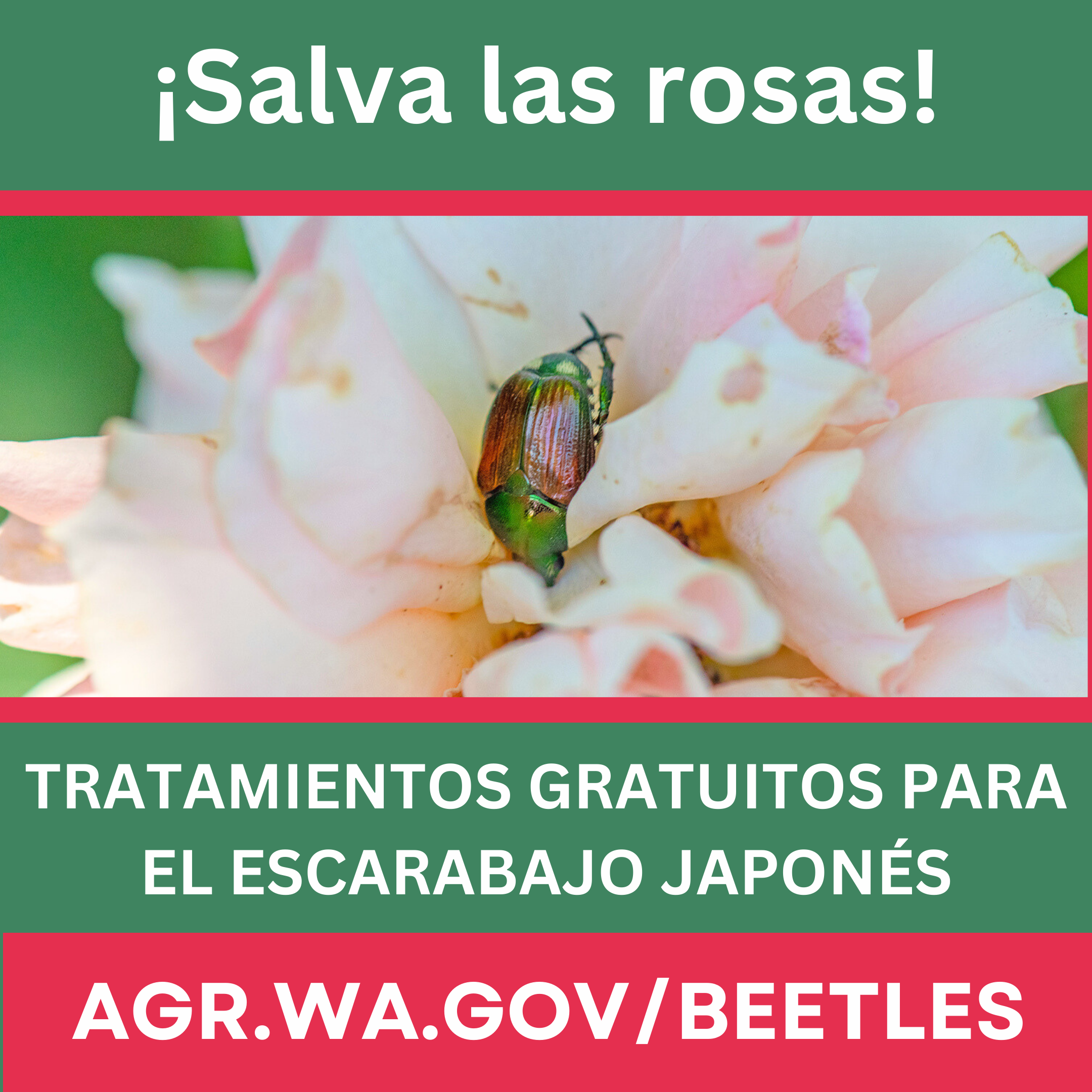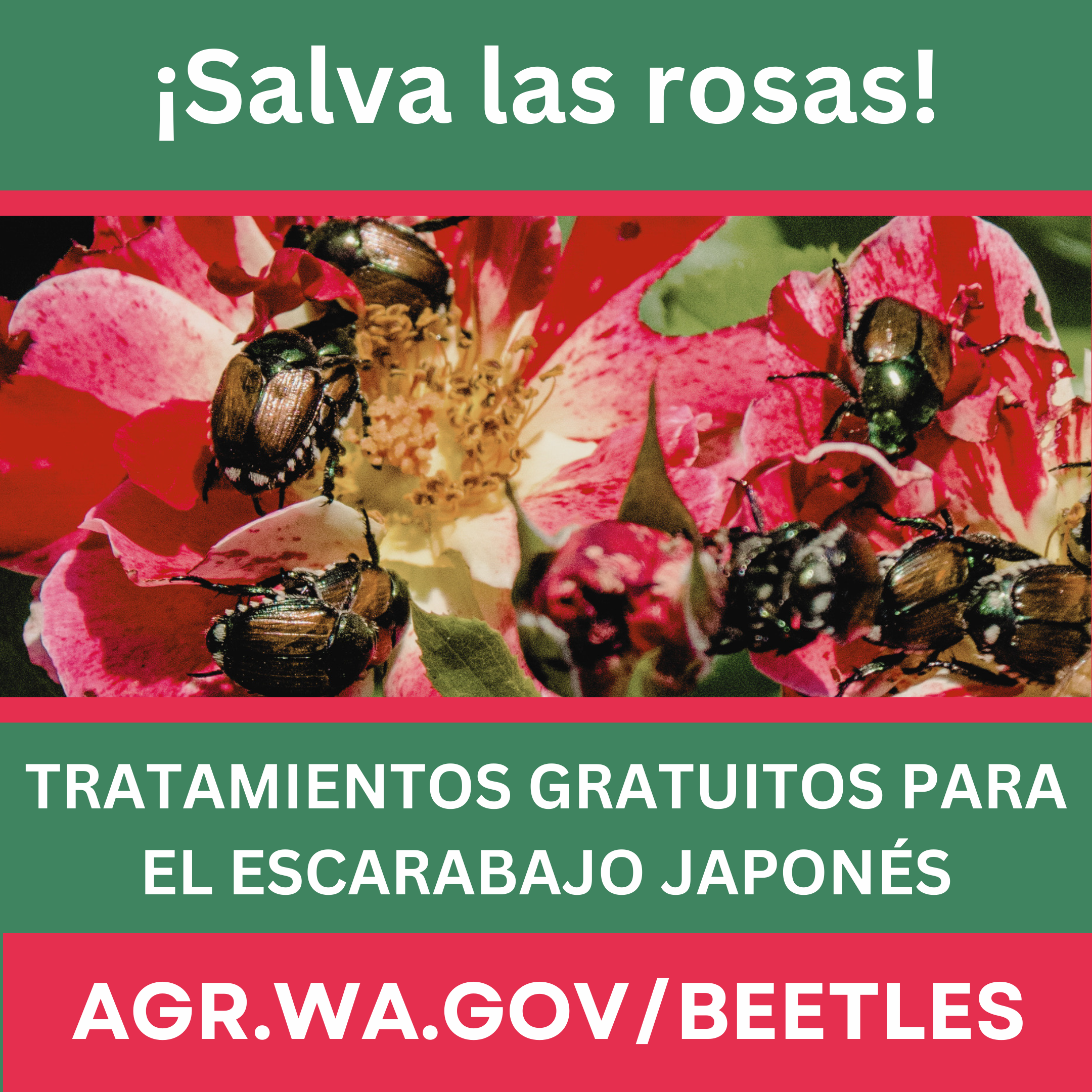 - ¿Amante de las rosas? Regístrese para recibir tratamientos GRATUITOS contra escarabajos japoneses si vive en un área de tratamiento propuesta. A los escarabajos japoneses les encanta comer rosas y se han encontrado miles de estas plagas invasoras en nuestra área. Obtenga más información e inscríbase en los tratamientos en agr.wa.gov/beetles.