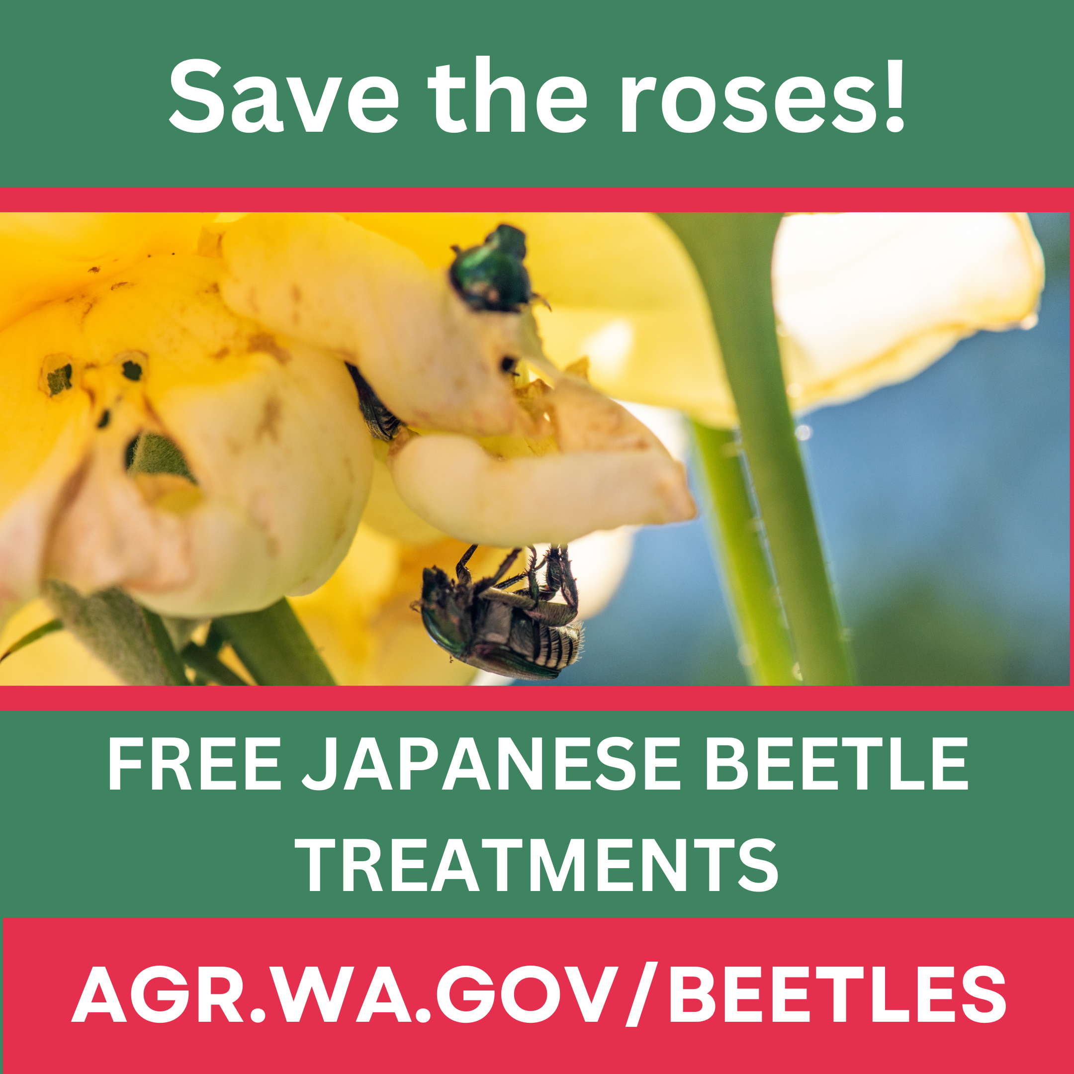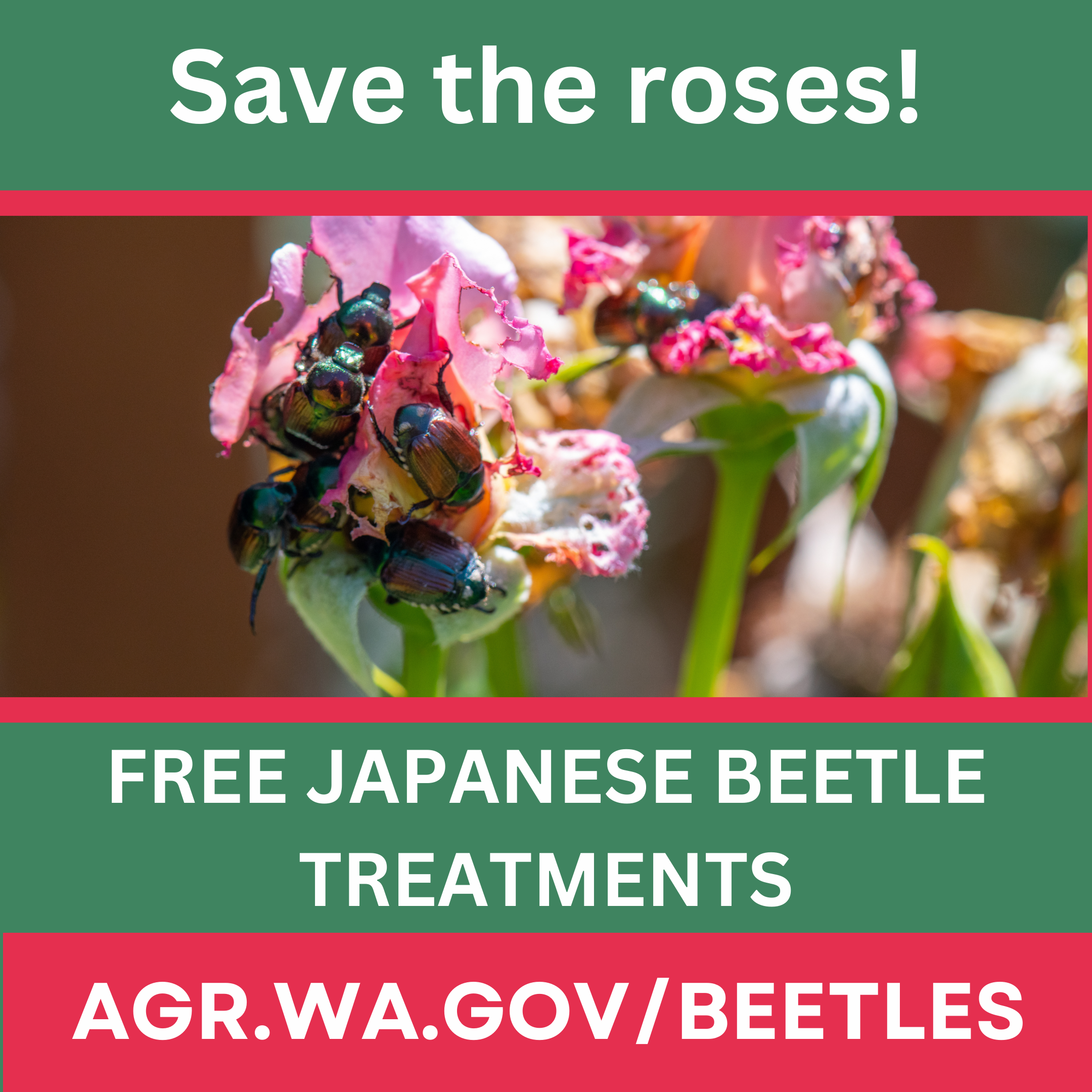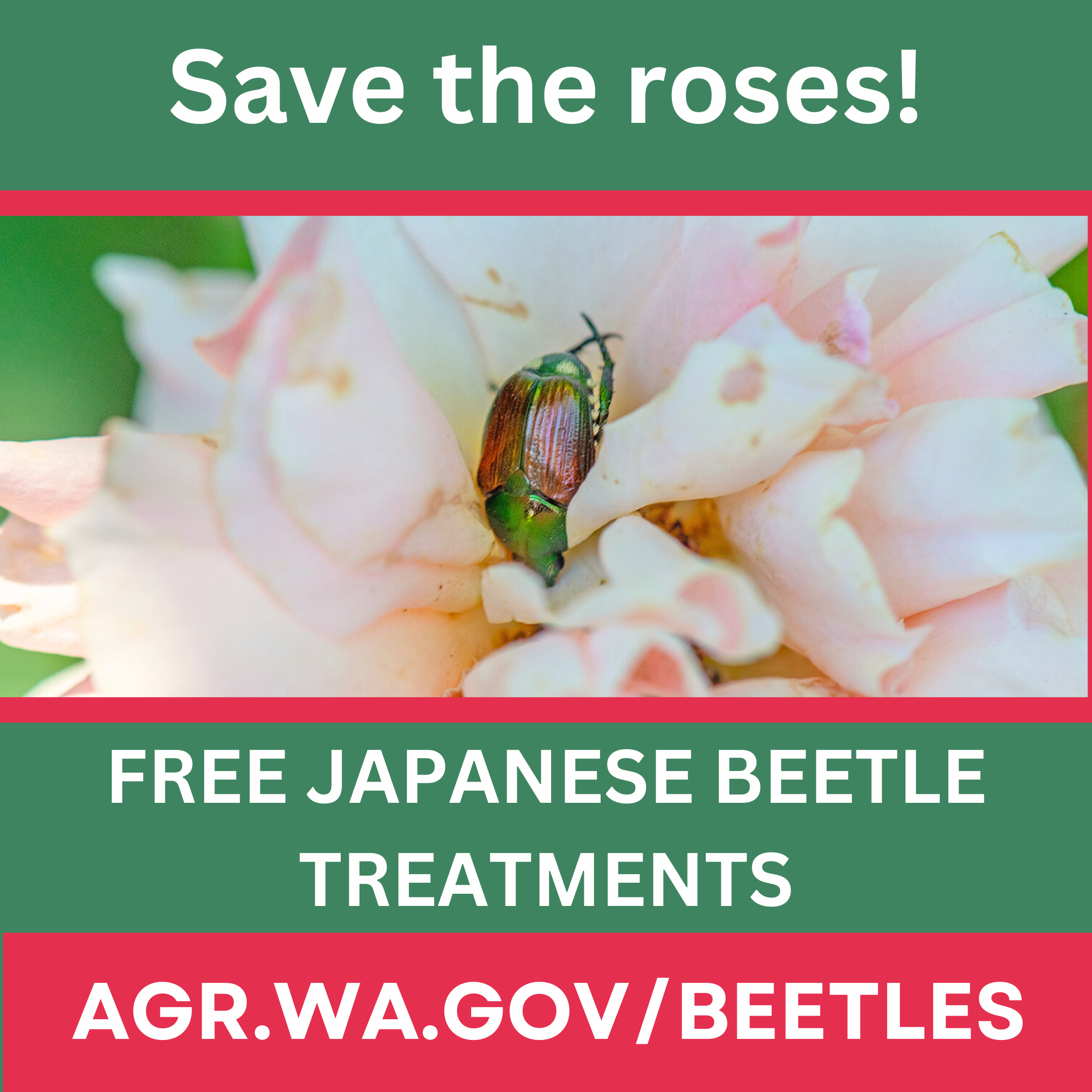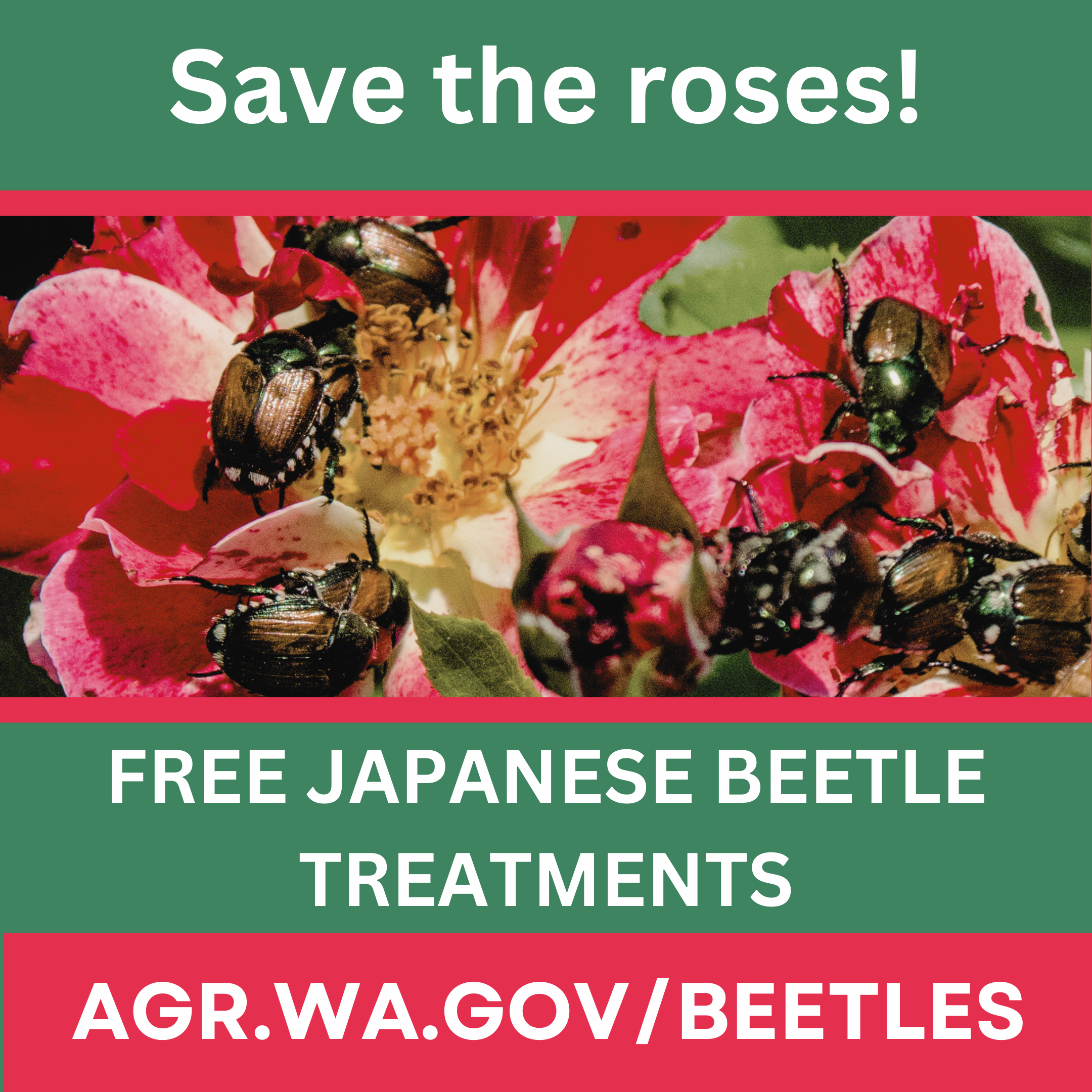 - Save our community’s roses – and over 300 other plants! If you live in a Japanese beetle treatment area, sign up TODAY to have your yard treated for Japanese beetles for FREE. Learn more and sign up at agr.wa.gov/beetles